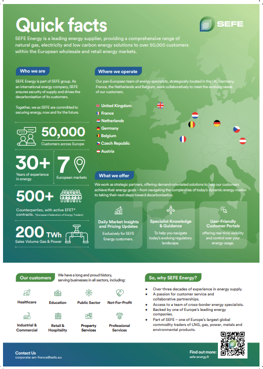 Fournir l’énergie et les solutions pour une société bas carbone : En France, SEFE Energy est un acteur reconnu sur le marché de la fourniture de gaz naturel pour des professionnels. SEFE Energy France dessert plus de 18 800 sites à travers le pays, des grandes industries aux petites entreprises, dans une variété de secteurs. L’entreprise propose également des solutions énergétiques bas carbone, adaptées aux besoins spécifiques de nos clients. Créé en 2006 Paris , SEFE Energy emploie aujourd’hui une soixantaine de salariés directs en France et a un réseau de partenaires. SEFE Energy a réalisé un chiffre d’affaires de 346,9 millions EUR en 2024.